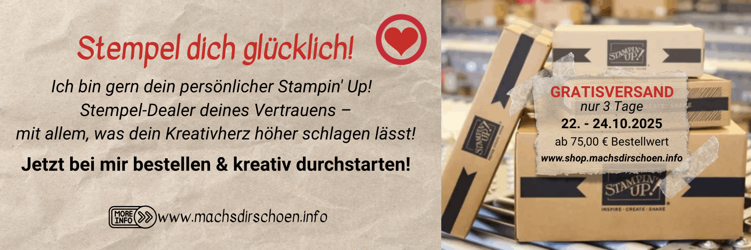 Vom 22. bis 24. Oktober 2025 bekommst du deine Stampin’ Up! Bestellung ab 75 € gratis direkt nach Hause geliefert. 🎉