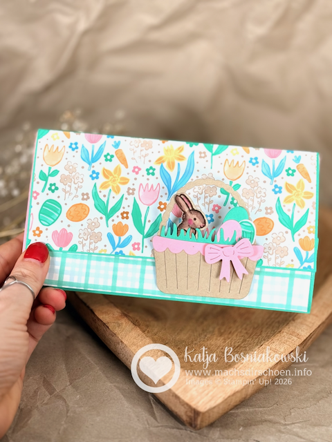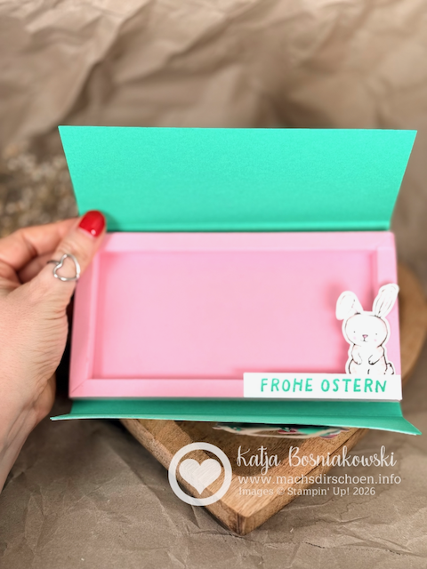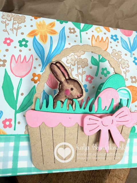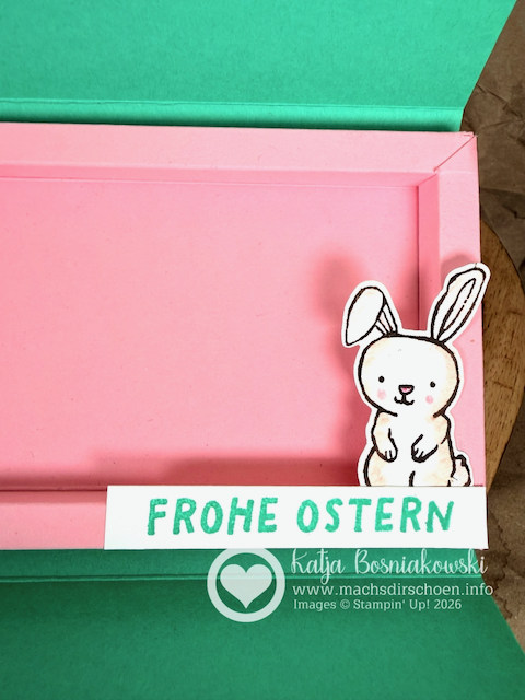 Und natürlich durfte auch hier ein Detail aus dem Stempelset nicht fehlen: Der kleine Hase mit dem Schriftzug „Frohe Ostern“, gestempelt in Glücksgrün, greift die Farben der Außenseite wieder auf.