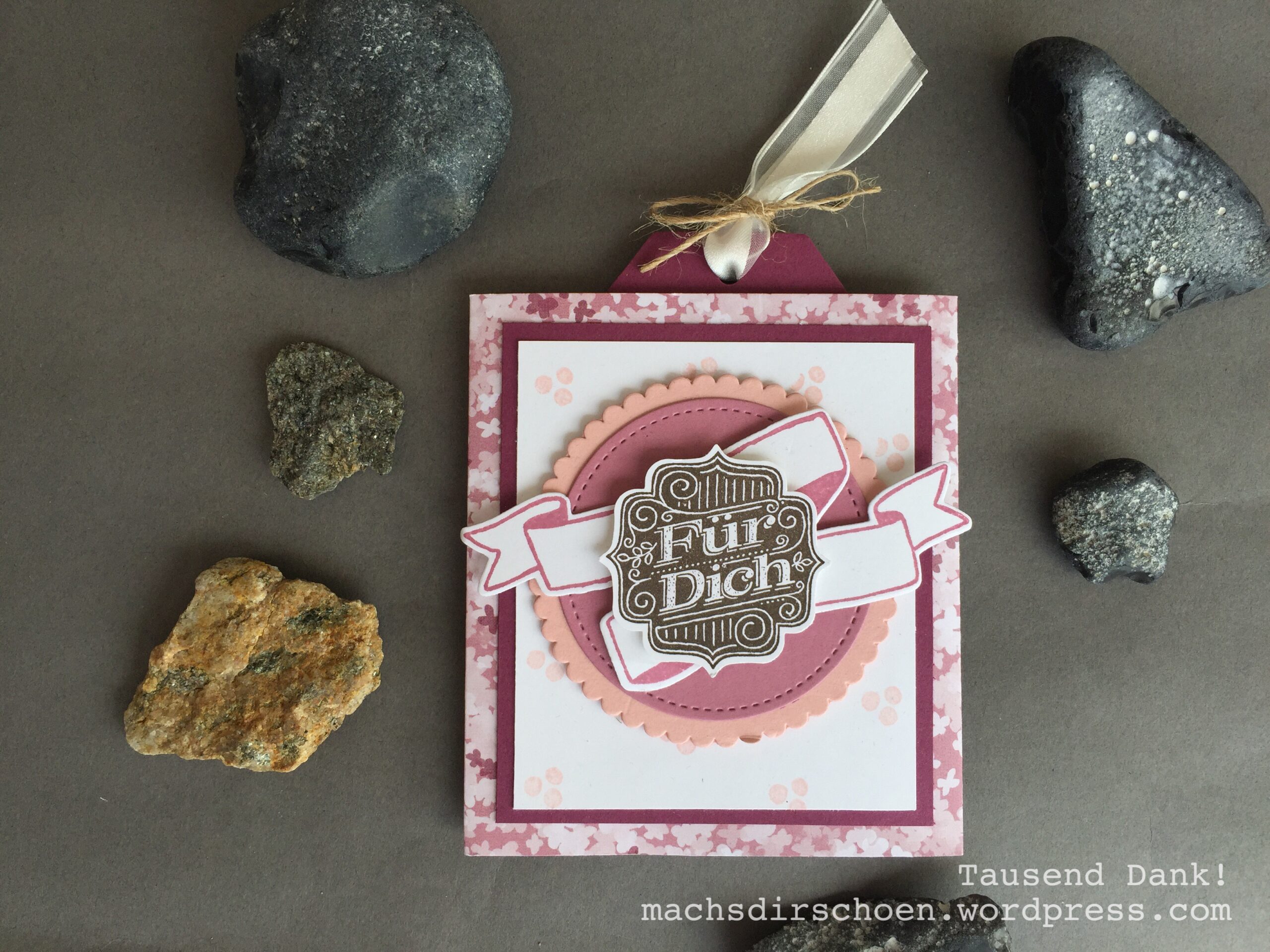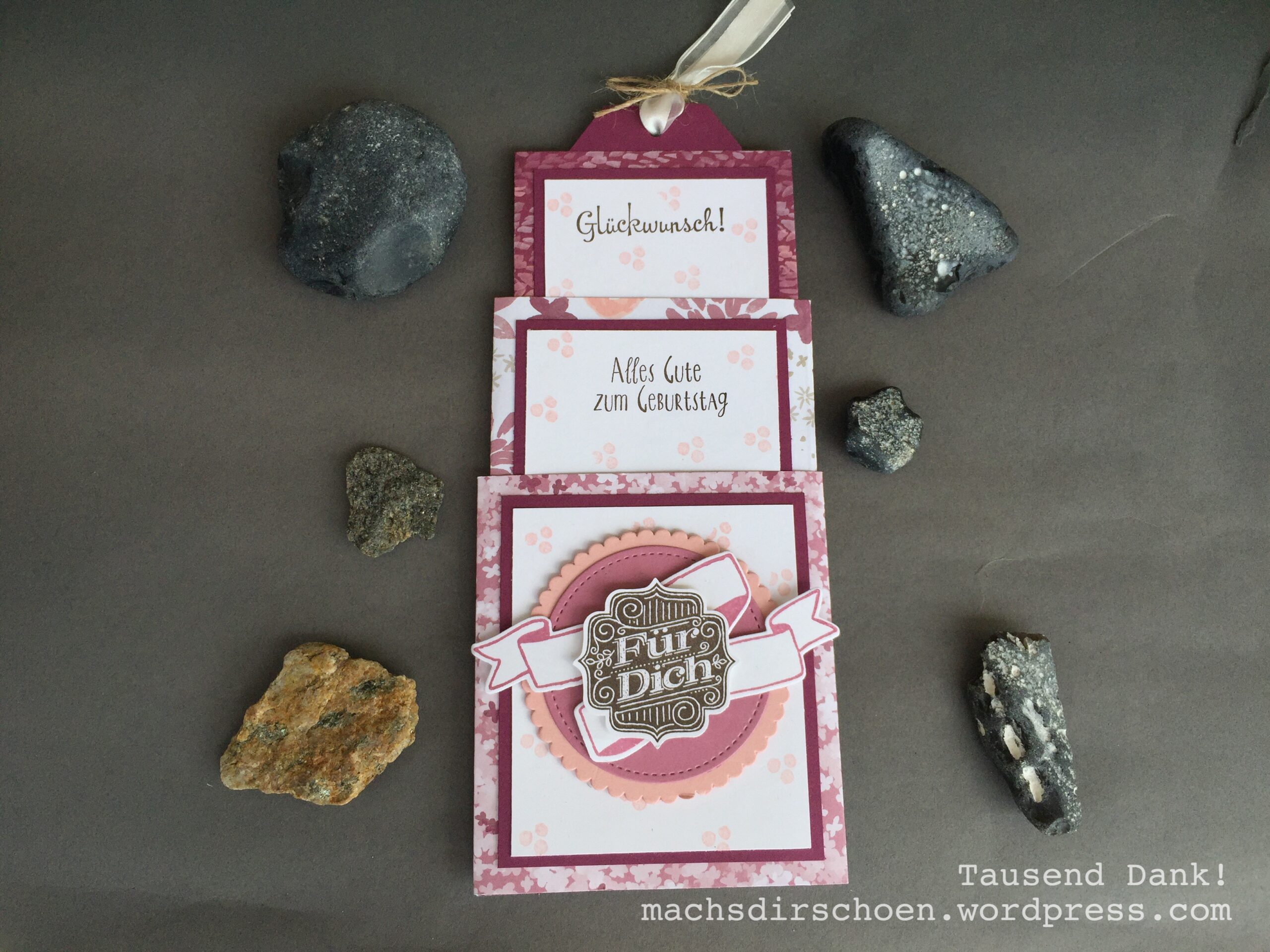 Neben einer genialen Karte in der Triple Tier Slider Card Technik (hier habe ich mal Ihren Blogbeitrag verlinkt) waren auch noch Tassenküchlein, Salbeibonbons, Eulen gefüllt mit Lippenbalsam und Handcreme (eine echte Wohltat für meine Hände. Mehrmaliges desinfizieren der Hände stand auf der Tagesordnung, da ein Magen Darm Virus grassierte, den keiner wollte) und ein Glas mit dem ich mir selber zuprosten konnte (ich erwähnte mal wie toll ich die Gläser finde, jetzt habe ich endlich eins ?). – Ein perfektes Geburtstagskurpaket!