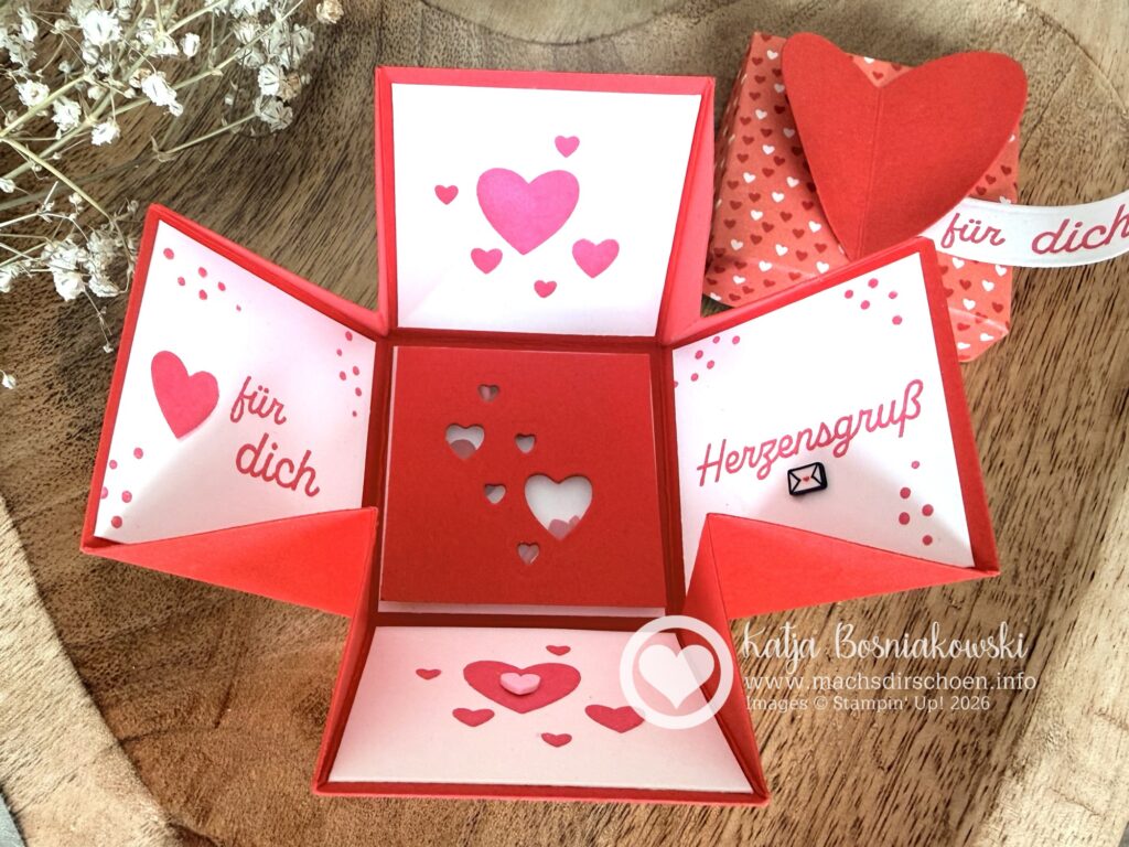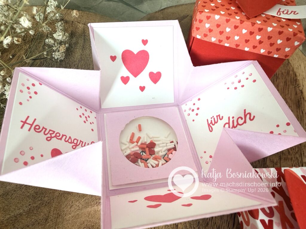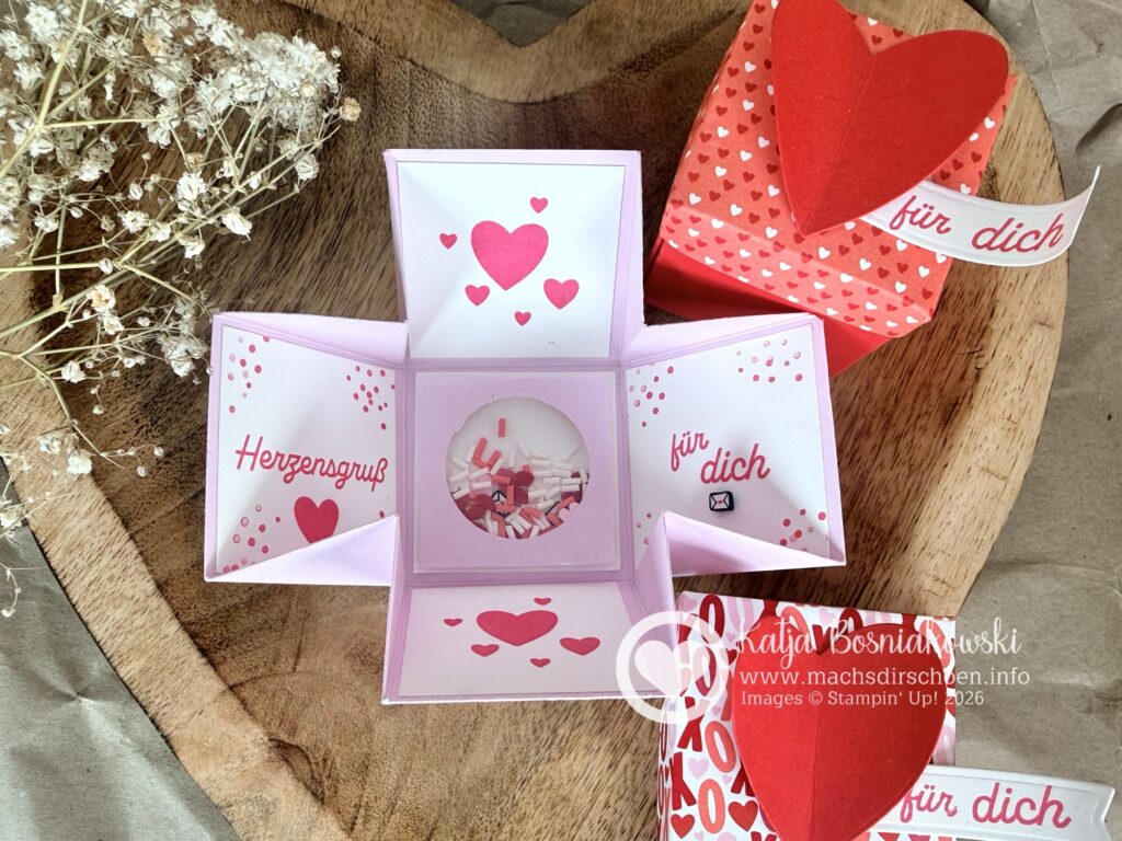 Die Kombination aus den wunderschönen Produkten „Liebe für immer“ und „Auf die Liebe“ von Stampin’ Up! macht diese Box zu einem perfekten Projekt für Valentinstag, Hochzeit, Jahrestag oder einfach, um einem Lieblingsmenschen zu zeigen: ich hab an dich gedacht. Beim Öffnen entfaltet sich die Box wie eine kleine Liebesbotschaft – und das Highlight wartet im Inneren: ein verspielter Schütteleffekt im Boden, der für den besonderen Wow-Moment sorgt.