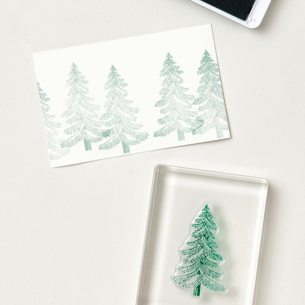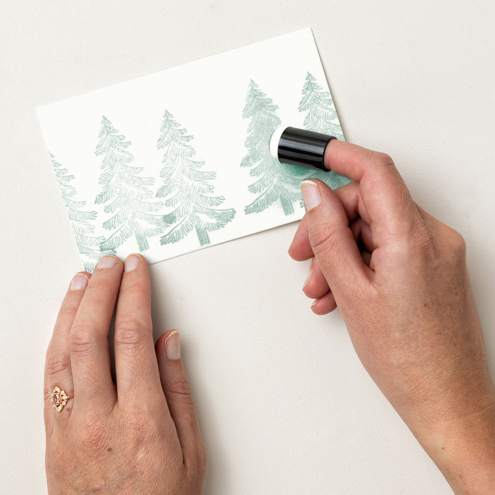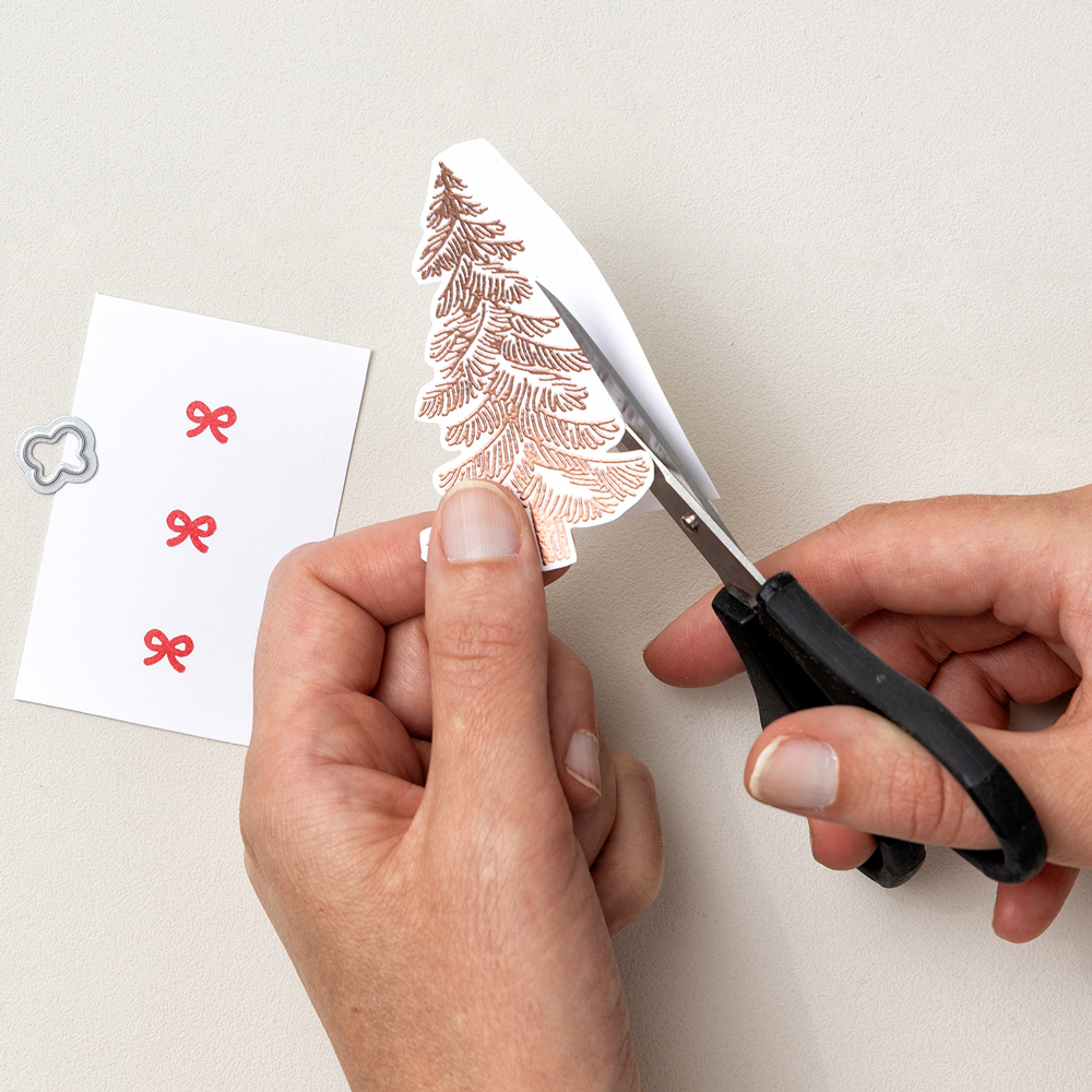 Schritt 3: Einen weiteren Baum heißprägen und von Hand ausschneiden. Die Schleifen stempeln und ausstanzen, auf den Baum kleben und auf der Karte arrangieren.
