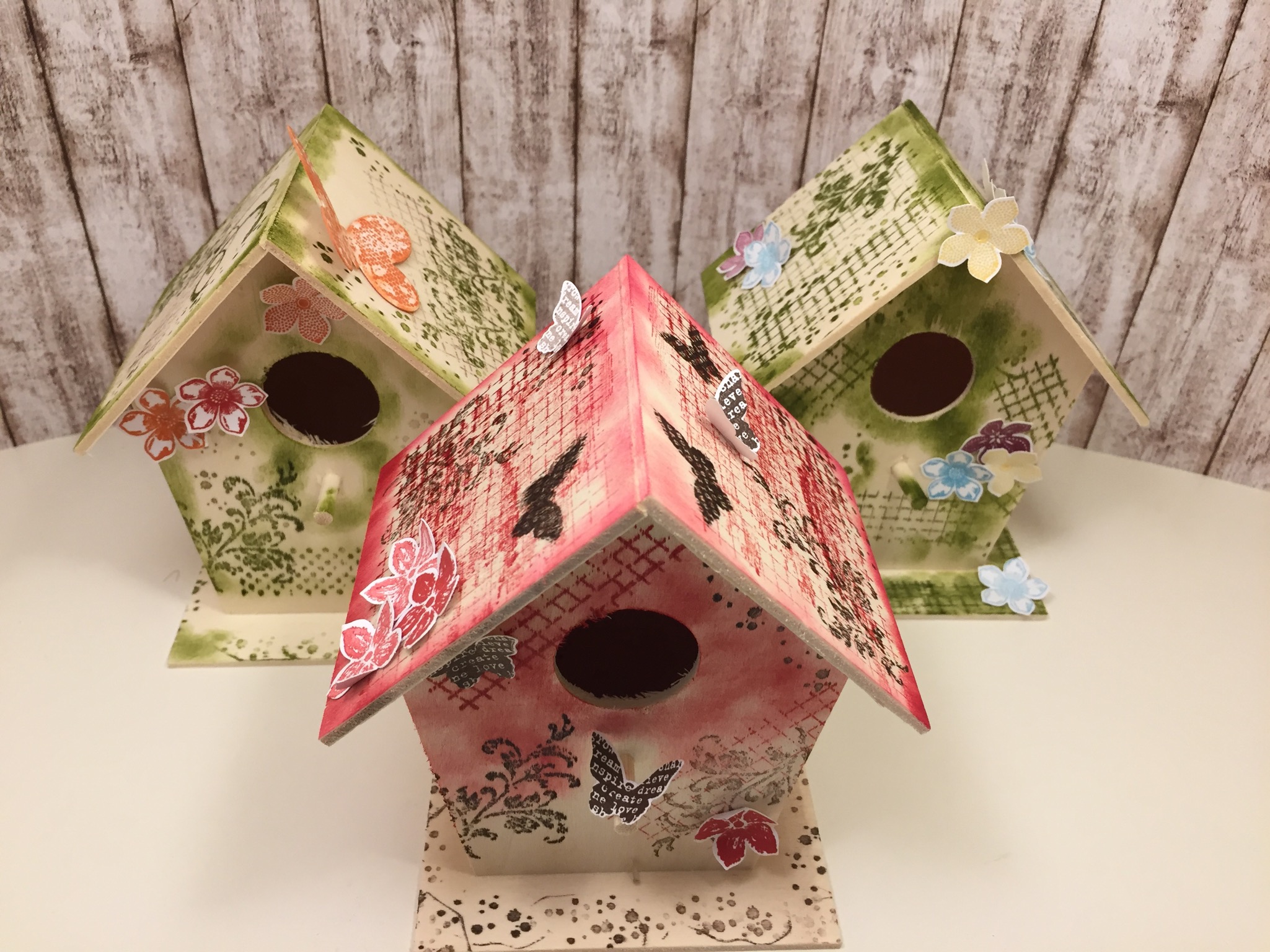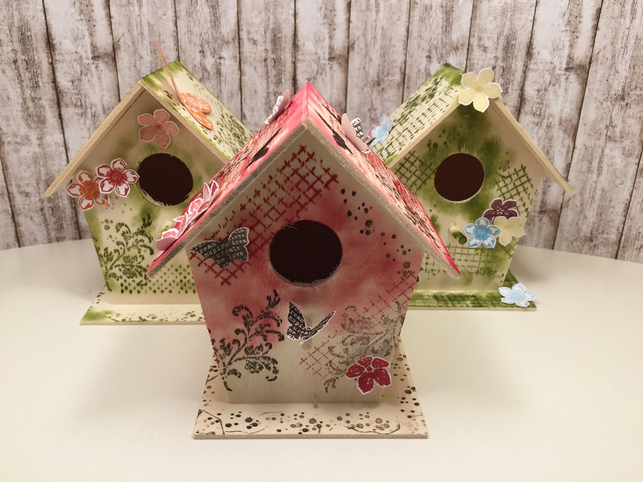 Last but not least, wollte ich mal zeigen, dass es nicht immer Papier sein muss was Frau bestempeln kann. Dabei sind ein paar hübsche Vogelhäuschen entstanden.