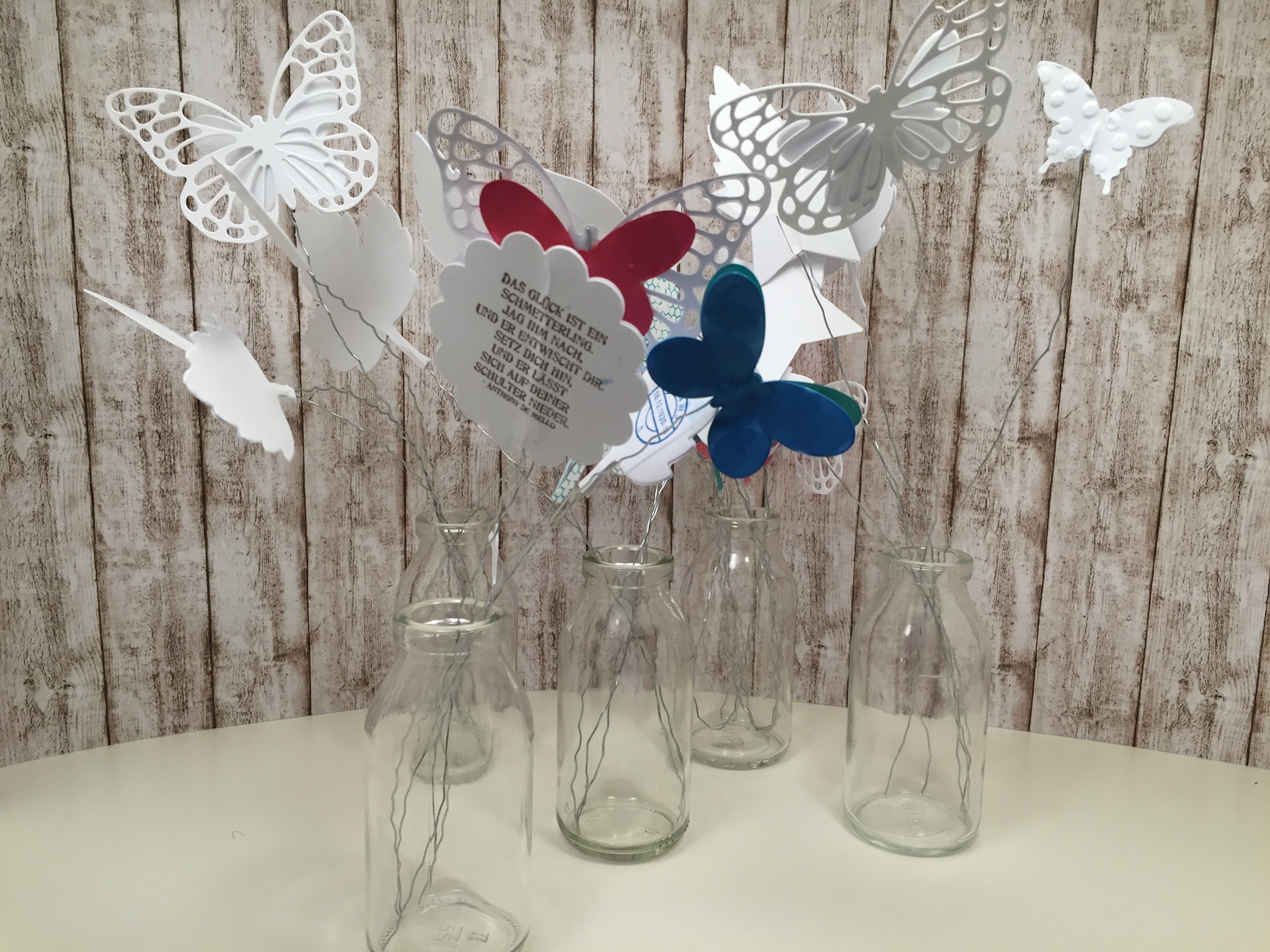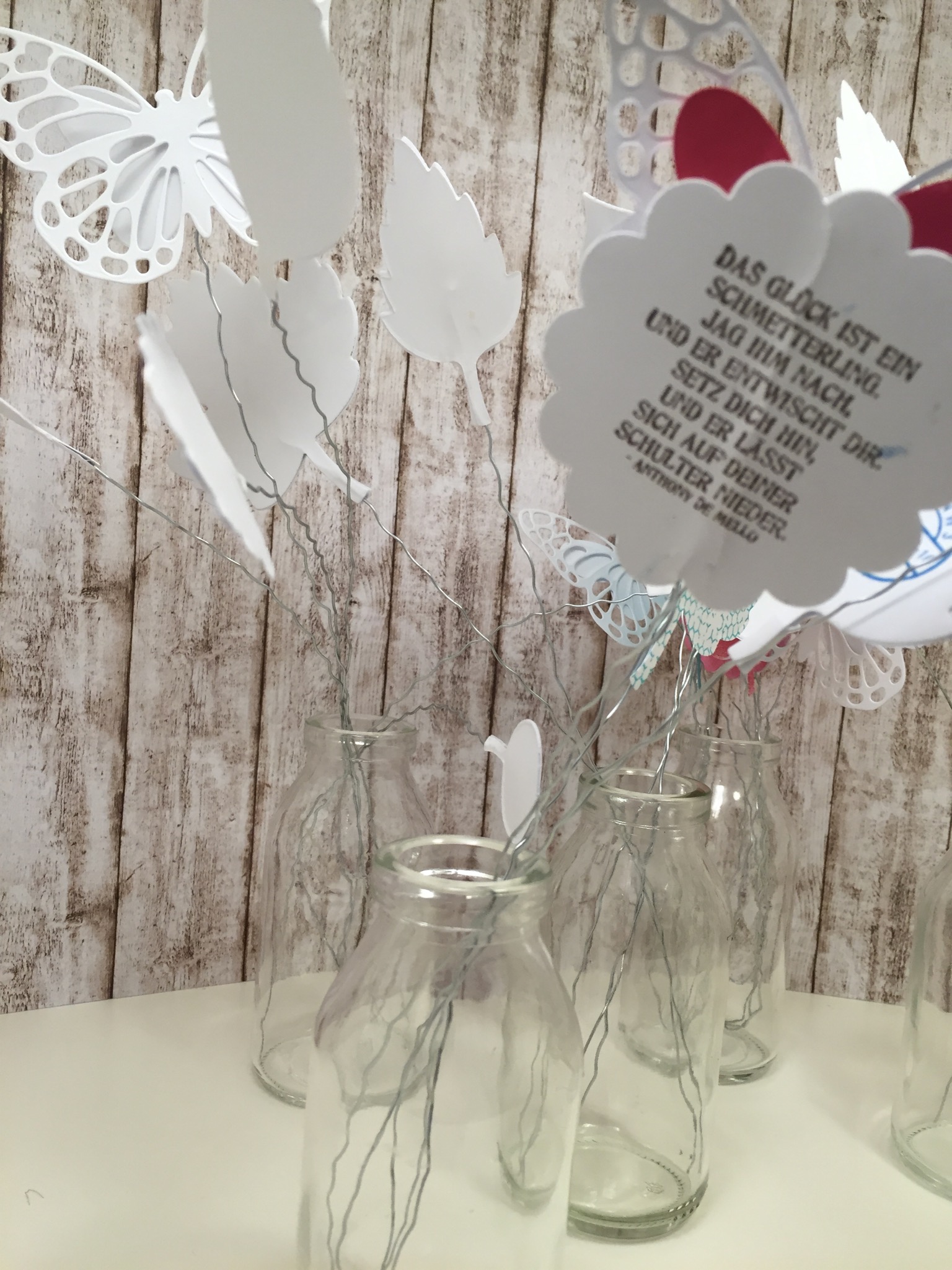Zusammen mit ein paar echten Blümchen sind diese eine sehr schnell gemachte und wunderschöne Deko. Mir gefällt es ganz schlicht in Weiß, aber man kann sie natürlich farblich seinem Geschmack und der Einrichtung anpassen.